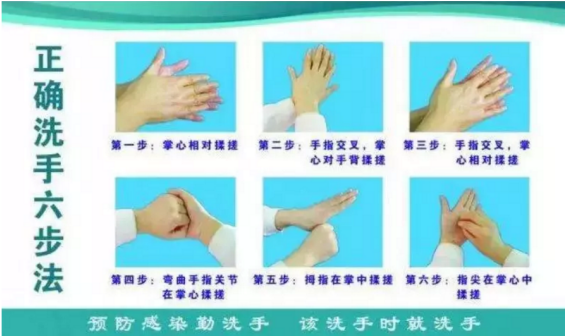 1、正确及时洗手。使用肥皂、洗手液并用流动水洗手,用“六步洗手法”彻底清洁双手,不用污浊的毛巾擦手,接触呼吸道分泌物后立即洗手。平时可用含75%酒精的消毒产品清洁双手。