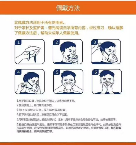 使用前先洗净双手,分清正反、上下,佩戴完毕后需要用双手压紧鼻梁两侧金属条,使口罩上端紧贴鼻翼两侧,并向下拉口罩,以盖住口鼻。