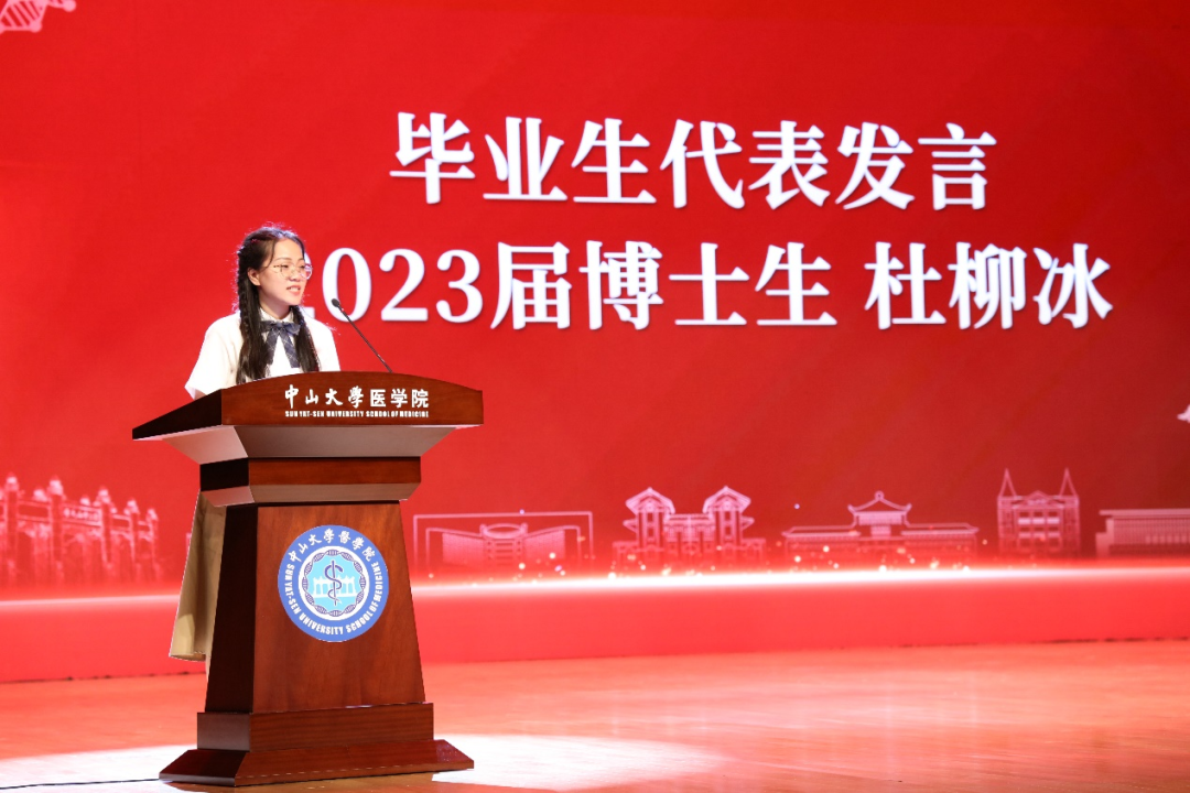 在毕业生代表发言环节,本科生代表李强和研究生代表杜柳冰同学都深情回顾了过去在医学院的求学之路,对学校、学院、附属医院的培养以及领导老师同学和亲朋好友的关心、爱护、指导和帮助表达了感恩之情,并代表所有毕业生发出新时代青年的心声:离开校园并不是结束,而是一个新的开始,站在新的起跑线上,让我们一起努力,为实现自己的梦想、为国家事业贡献自己的力量而奋斗。