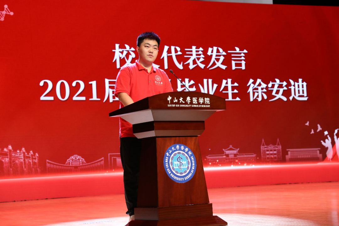 医学院第一届本科毕业生徐安迪校友回顾了自己在医学院和中山眼科中心的求学经历,分享了自己在科研和临床方面实实在在的经验,并希望毕业生们能始终保持对医学事业的热情和信念。同时他也表达了对医学院培养的感激之情,祝福医学院不断发展壮大,早日成为我们国家的名医摇篮。