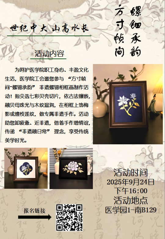 呵护医学院职工身心,丰盈文化生活,医学院工会邀您参与 “方寸帧间・螺钿承韵” 非遗螺钿相框画制作活动!指尖选七彩贝壳切片,依古法镶嵌,融贝母珠光与木纹温润,在相框上饰梅影或缠枝莲纹,做专属非遗手作。活动助您卸疲惫、近非遗,借着手作增情谊,传递 “非遗融日常” 理念,享受传统美学时光。