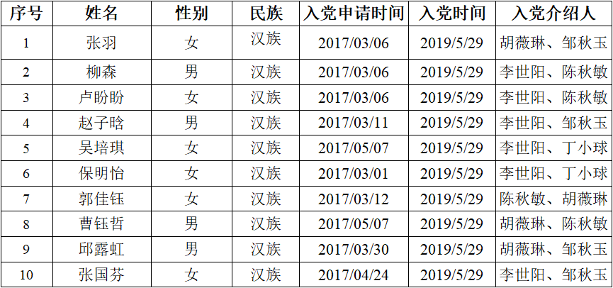 通过一段时间的培养考察,经医学院济世第一支部讨论决定,拟吸收张羽等10位同志为中共预备党员,现予以公示,公示期为5天。如有异议,请于公示期内与学院党政办公室联系。