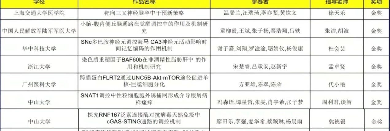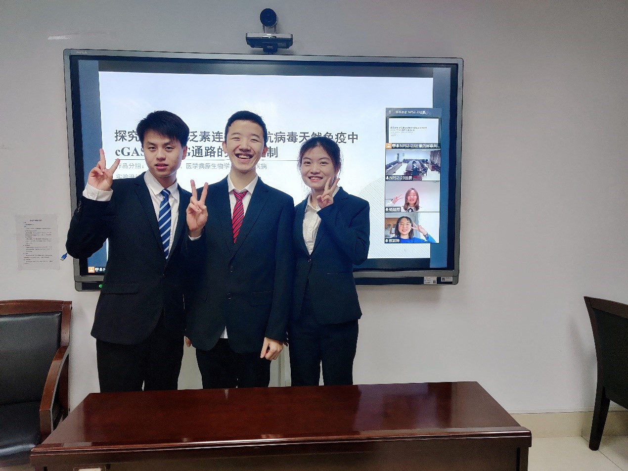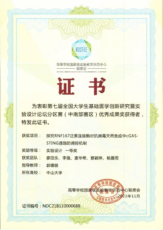 在本次大赛中,由我院2018级临床医学本科生李强、2019级临床医学本科生廖田乐、麦华希、蔡颖琳、杨晨雨组成的团队,在医学院郭德银教授的指导下,以参赛项目《探究RNF167泛素连接酶对抗病毒天然免疫中的cGAS-STING通路的调控机制》做大赛报告,凭借扎实的基础知识、过硬的专业素养、灵活机变的发挥,在实验设计本科赛道中获中南部赛区一等奖、总决赛金奖和最佳风采奖。这是我院首次独立组队获得国家级科学类竞赛一等奖。
