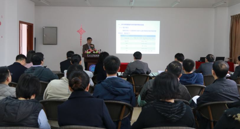 陈元副院长就我院2018年教学工作做总结汇报,对2018年学院教师参与中山医教研室教学活动的情况做了具体分析,肯定大家参与教学活动的认真负责,指出存在的问题并提出整改措施;对新学期加强教研室基础建设、遴选学院临床教学师资队伍、组织申报生物医学本科专业和加快医学院实验教学中心建设等教学重点工作做了具体的安排。